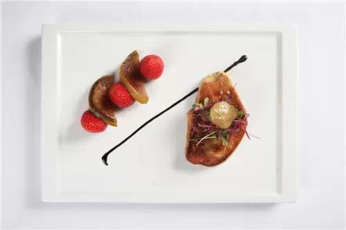 120克鹅肝、20克松露、10克梨、适量新鲜草莓及迷你生菜、20克糖、10克黄油、50克葡萄黑醋、适量盐及黑胡椒粉