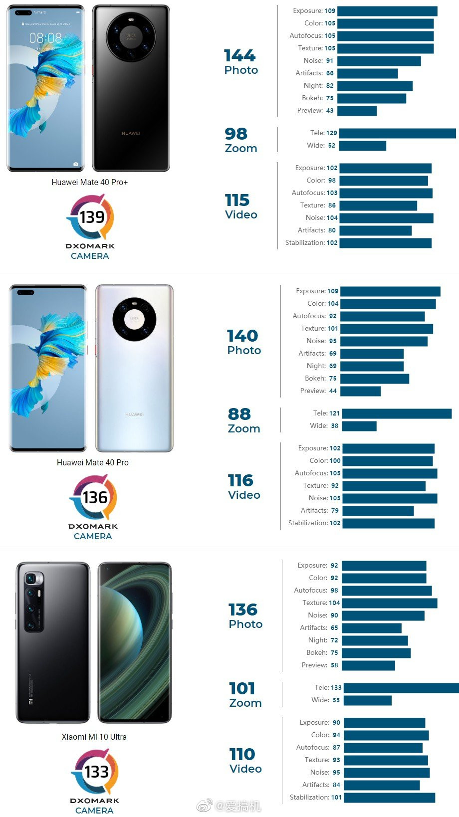 另外,让人迷惑的是,Mate40 Pro+的视频分,比现役视频最高分的Mate40 Pro低一分(光学防抖还帮倒忙?)。但仔细一想,DxOMark并未说明它是用哪个摄像头拍的视频,而Mate40 Pro拍视频时,又是默认用超广角镜头的,所以……