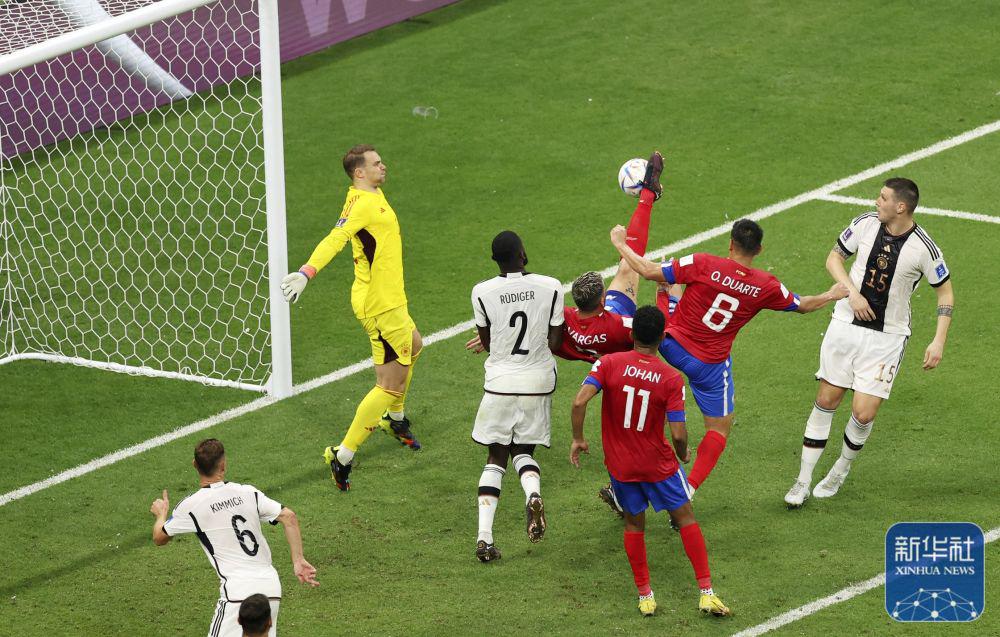 ↑哥斯达黎加队球员巴尔加斯(右四)在比赛中射门得分。新华社记者 潘昱龙 摄