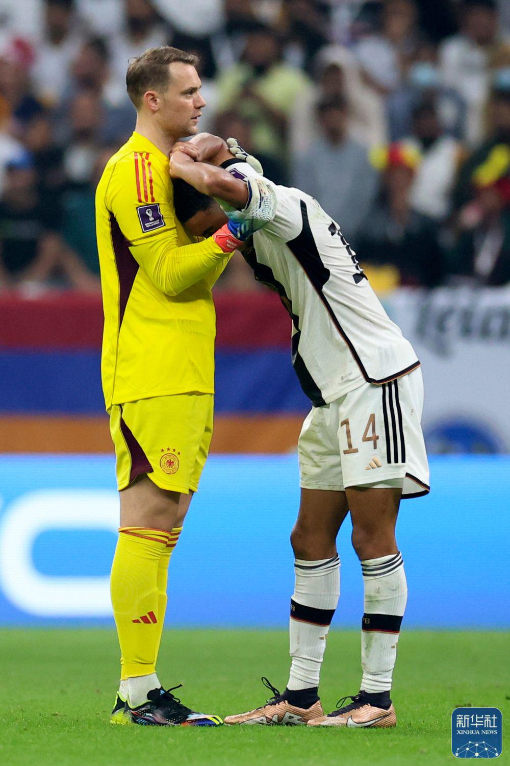↑德国队守门员曼努埃尔·诺伊尔(左)与队友贾迈勒·穆夏拉在比赛后。新华社记者 李明 摄