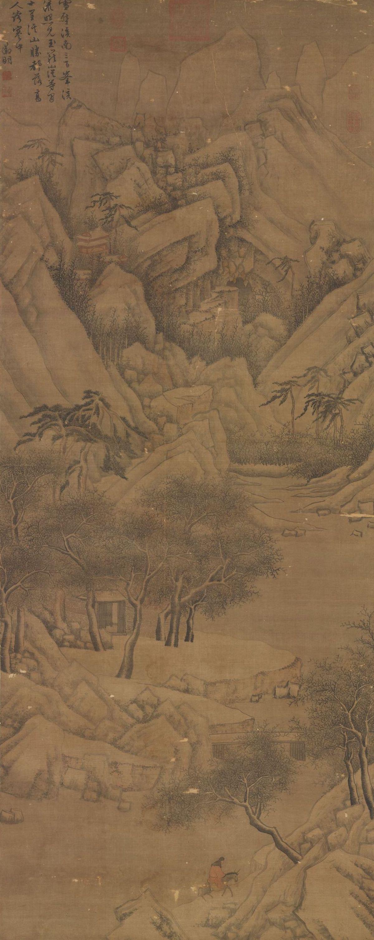 此幅作群峰堆雪,溪桥篱舍,一红衣人蹇驴踏雪而归。笔意拙厚,用墨设色,简远雅淡,极得清冷秀隽之致。