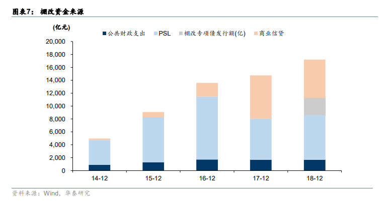 棚改投资的资金来源可以拆分为四个主要部分:PSL、商业银行贷款、棚改专项债以及公共财政支出。其中PSL是最重要的资金来源,在所有资金来源中占比最高。2014-2018 年,PSL合计占比达到 57%。