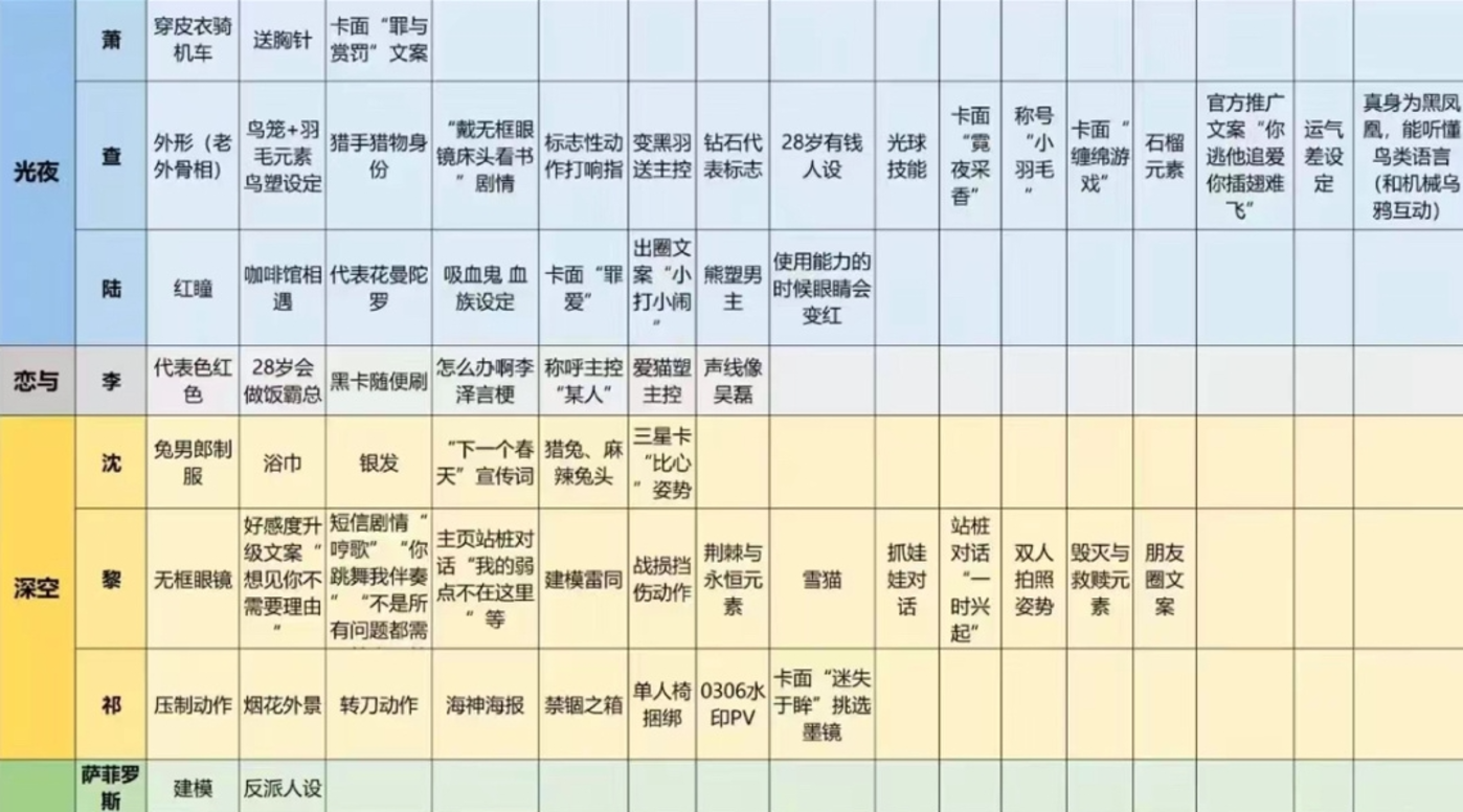 比如红玫瑰是《恋与制作人》男主李泽言的标志性元素,《恋与深空》男主祁煜使用了红玫瑰被质疑抄袭挪用;同样是《恋与深空》的男主,祁煜的烟花卡在前,秦彻的剧情卡出现了烟花元素就被质疑抄袭;《光夜》查理苏出了黑凤凰设定,《世界之外》顾时夜的黑凤凰卡也被骂了......
