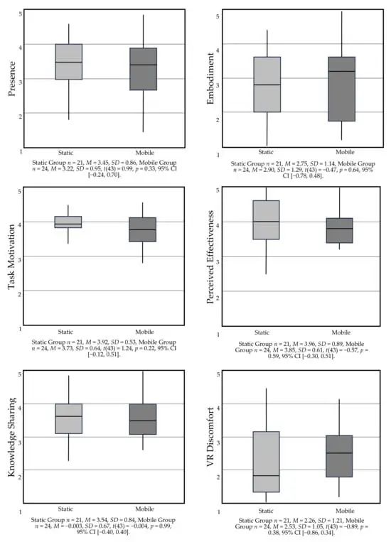 假设 2 (H2)。与静态平台组相比,移动平台组将体验到明显更高的临场感 (H2a)、体现感 (H2b)、任务动机 (H2c)、感知有效性 (H2d)、知识共享 (H2e) 水平,以及更低的 VR 不适感 (H2f)。