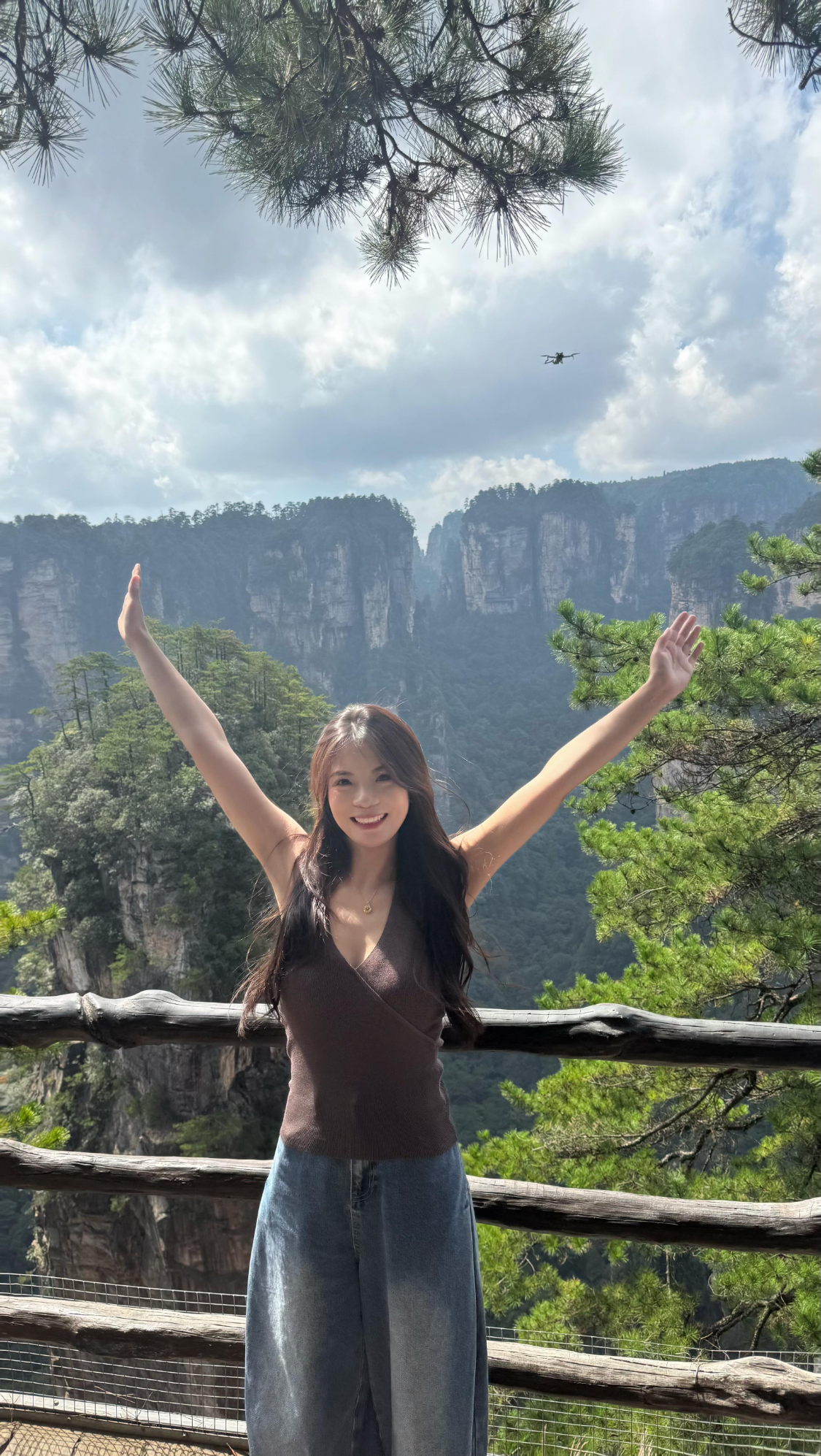 第三天,漫步金鞭溪,溪水清澈见底,阳光透过树叶洒下斑驳光影。溪边的猕猴活泼机灵,时不时跑来讨要食物。“别盯着它们的眼睛,慢慢把零食收好。” 婷婷及时提醒我,还教我安全逗猴的小窍门。下午前往天门山,乘坐世界最长的高山索道,从市区到山顶,景色不断变换。攀登天门洞的九百九十九级台阶时,我累得气喘吁吁,婷婷一边递上纸巾和巧克力,一边为我加油打气,最终我成功登顶,俯瞰群山,成就感满满。
