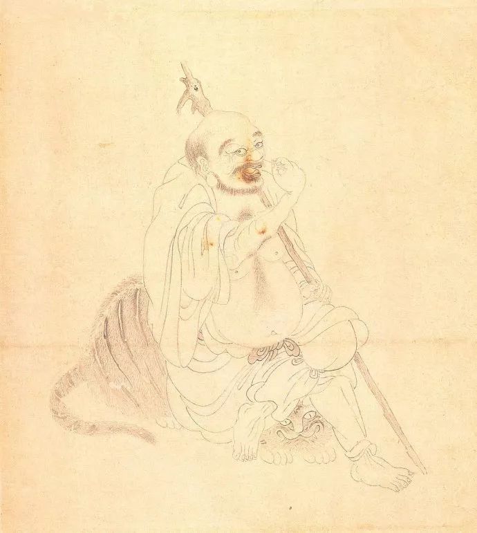 从明末丁云鹏的十六罗汉图,可以看到李公麟的遗风。十六尊者个个形貌有别,姿态各殊,须眉毫发刻画入微,衣纹细劲流畅,恍若行云流水。线条迂回荡漾,富有节奏。