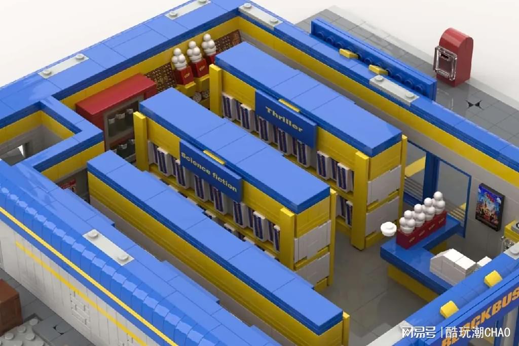成立于 1985 年的百视达,曾一度垄断了美国家庭影视租赁市场。这个作品以模块化形式呈现了一家百视达娱乐连锁店,并在门口设计了一个停车场。模型中还包含了 Blockbuster 标志,以及外部投递箱供顾客归还租赁物品。