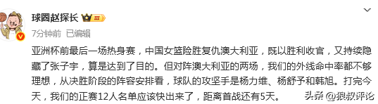 媒体人赵探长发文点评:亚洲杯前最后一场热身赛,中国女篮险胜复仇澳大利亚,既以胜利收官,又持续隐藏了张子宇,算是达到了目的。但对阵澳大利亚的两场,我们的外线命中率都不够理想,从决胜阶段的阵容安排看,球队的攻坚手是杨力维、杨舒予和韩旭。打完今天,我们的正赛12人名单应该快出来了,距离首战还有5天。