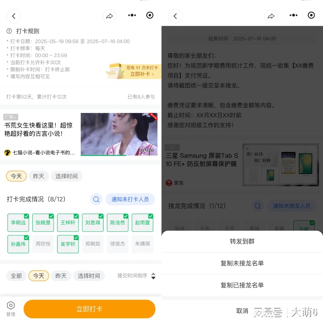 ·选定参与人后,能随时把接龙进度发到群里督促提交;
