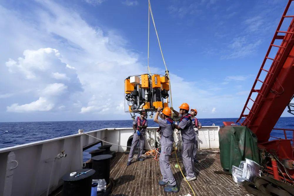 7月8日,科研人员将无人潜器吊运入海开展科考试验。 新华社记者 张建松 摄