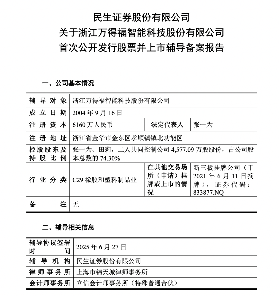 瑞财经 吴文婷 近日,浙江万得福智能科技股份有限公司(以下简称“万得福”)启动A股IPO辅导,辅导机构为民生证券股份有限公司,律师事务所为上海市锦天城律师事务所,会计师事务所为立信会计师事务所(特殊普通合伙)。