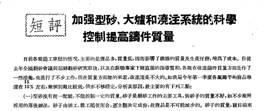 本期发表了一篇《加强型砂、大炉和浇注系统的科学控制提高铸件质量》的短评。文章针对1953年的全国翻砂会议以及开设翻砂研究班后,各厂在改进铸件方面存在的问题,如型砂配置不统一、大炉供应不能科学控制、浇注系统不够科学等,以上海机床厂为试点开展工作,认为必须从型砂、大炉和浇注系统着手改进。