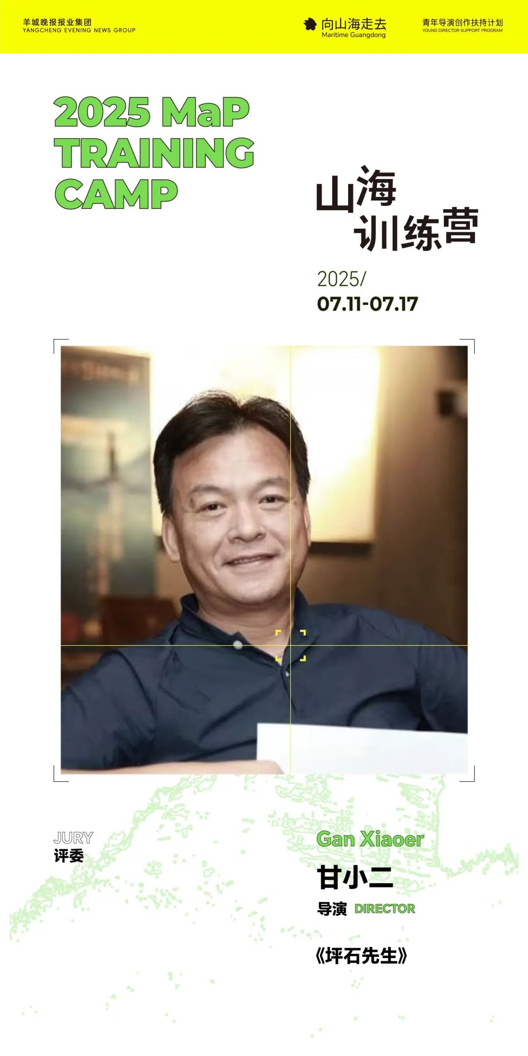 湾区共潮,再汇羊城。7月11日至17日,由羊城晚报报业集团主办、广州市花都区委宣传部支持的山海训练营将在广州中旅·阿那亚·九龙湖开营,开启为期七天的深度电影交流和创作之旅。