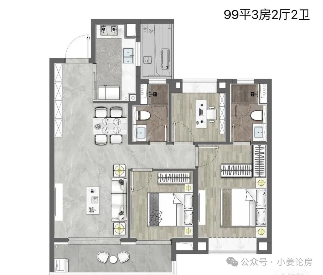 项目主推建面约99㎡3房2厅2卫、约114㎡3房2厅2卫及约142㎡4房2厅2卫,均价约99000元/㎡,总价约868万起。