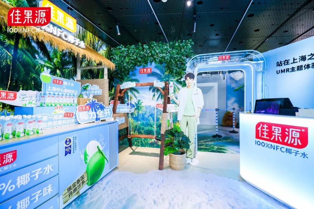 从现场的布置来看,“云端椰境”主题店巧妙地将上海中心的地标高度与佳果源椰子水的天然属性做了融合。首先,上海中心118层作为国内最高的观景平台之一,其壮阔的城市景观与登高运动场景,与佳果源椰子水主打的“天然电解质、快速补水”产品卖点较为契合,据了解,佳果源也将在第四季度赞助上海中心筹备的“垂直马拉松”运动赛事。