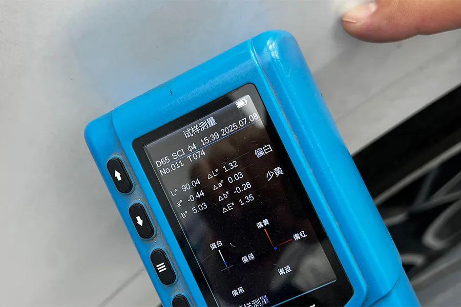 经过测试,最大色差值位于左前翼子板处,色差值为1.35ΔE,比基准点偏白少黄。从数值上来看,这辆车的喷漆工艺质量控制还不错。