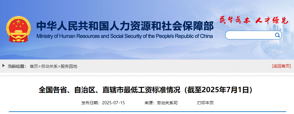 7月15日,人社部官网公布全国各省、自治区、直辖市最低工资标准情况(截至2025年7月1日)。