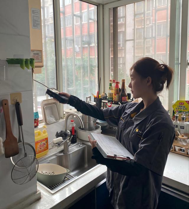 上午10点,唐泽华准时出现在负责的小区。她从顶楼开始逐层往下安检。“您好,我是郑州华润燃气的,来给您家做每年一次的安全检查”这句话,她每天都要重复几十次。背着近8斤重的工具包,在无电梯的楼道里往返,工装被汗水浸透又晒干,结出盐渍,肩膀虽被包带勒出红痕,但始终稳稳握着检漏仪,仔细扫描燃气管道接口,连灶台下的隐蔽角落都不放过。