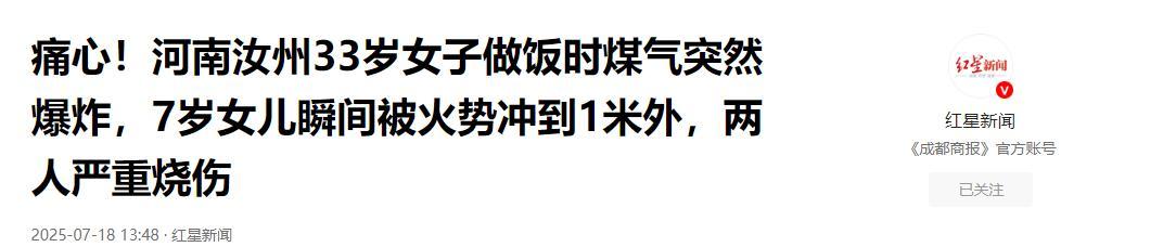 红星新闻2025-07-18——痛心!河南汝州33岁女子做饭时煤气突然爆炸,7岁女儿瞬间被火势冲到1米外,两人严重烧伤