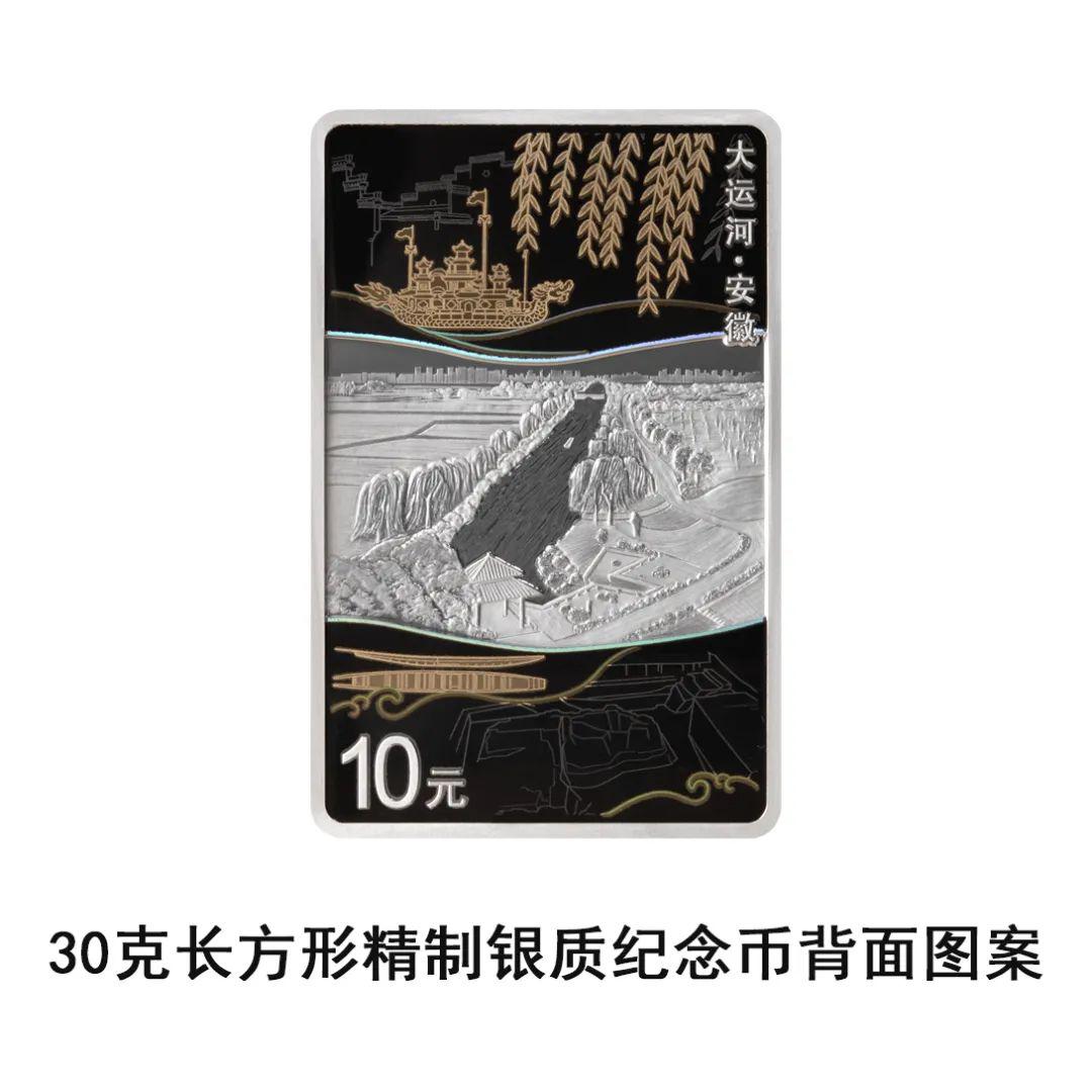 30克长方形银质纪念币背面图案以通济渠为主要场景,衬以徽派建筑、龙舟、柳枝、柳孜运河遗址、出土古船复原图等,并刊“大运河·安徽”字样及面额。