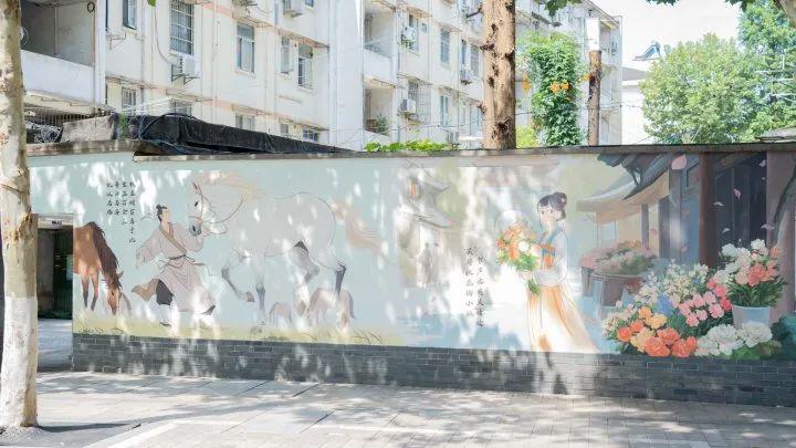 左侧,吴越国士兵牧马,右侧,南宋文人赏花品茗,中间串起上世纪小卖部到潮流咖啡店的市井变迁,旧墙成了一幅可触摸的“文化长卷”。