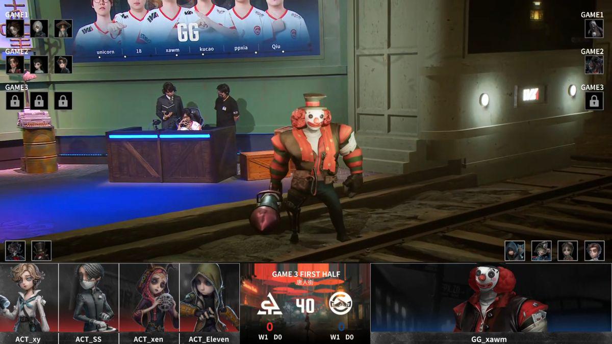 ACT的求生者选择了气象学家、入殓师、祭司、佣兵(BAN歌剧演员、邦邦);成都GG的监管者xawm选择了小丑。(BAN先知、火灾调查员、机械师、小说家)