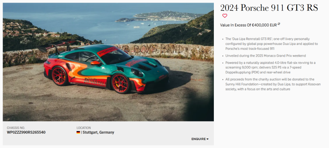 据悉,这辆联名特别定制版跑车名为「Dua Lipa Rennstall GT3 RS」,于2025年摩纳哥大奖赛周末首次亮相,目前正通过RM苏富比进行拍卖,将于8月1日截止。
