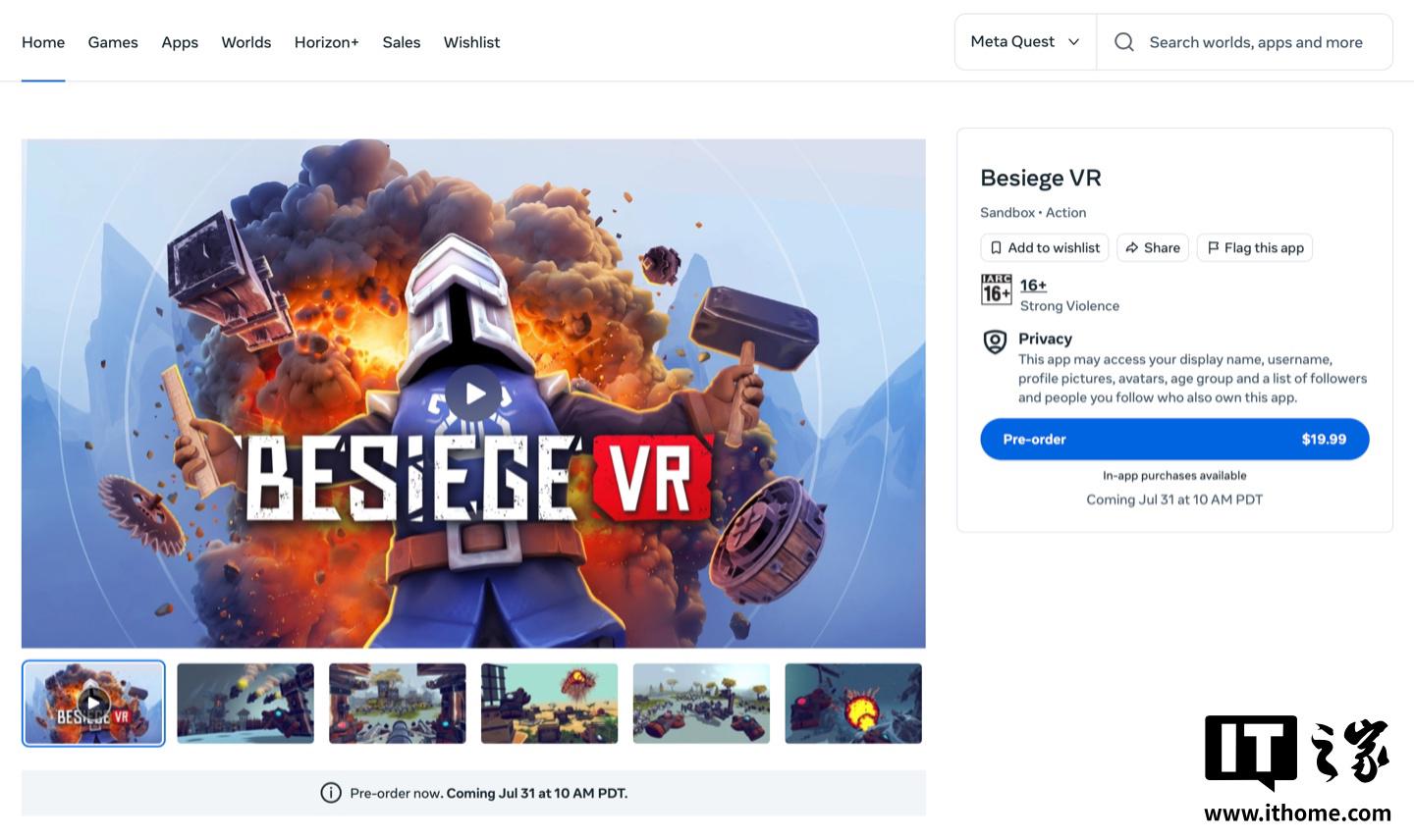 IT之家 7 月 20 日消息,开发商 Spiderling Studios 宣布旗下经典策略物理游戏《围攻(Besiege)》将于 7 月 31 日登陆 Meta Quest VR 平台,定价 19.99 美元(IT之家注:现汇率约合 143.5 元人民币),IT之家附游戏商品页如下(https://www.meta.com/experiences/besiege-vr/8981075088581523/)。