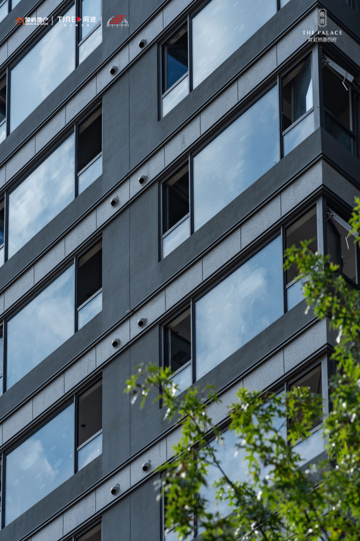 建筑方面,虹桥嘉悦府汲取高级灰经典美学灵感,以珍珠蓝石材、多彩仿石漆、灰色铝板搭配宽幕玻璃,整体呈现玻璃流幕现代立面,经典永不过时。
