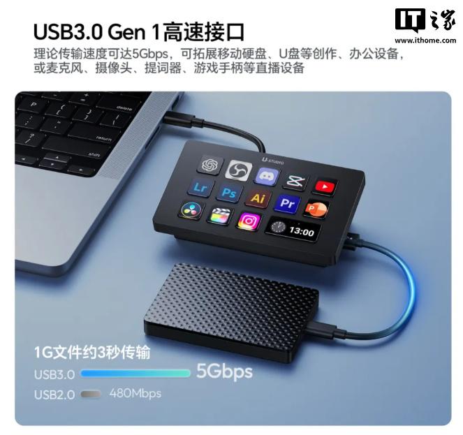 软件方面,这款键盘支持 Ulanzi Studio 应用市场,可通过该市场获取应用插件、预设文件、图标包及配套软件等,目前已兼容 ChatGPT、豆包、Deepseek、OBS、哔哩哔哩直播姬、YouTube 等应用。