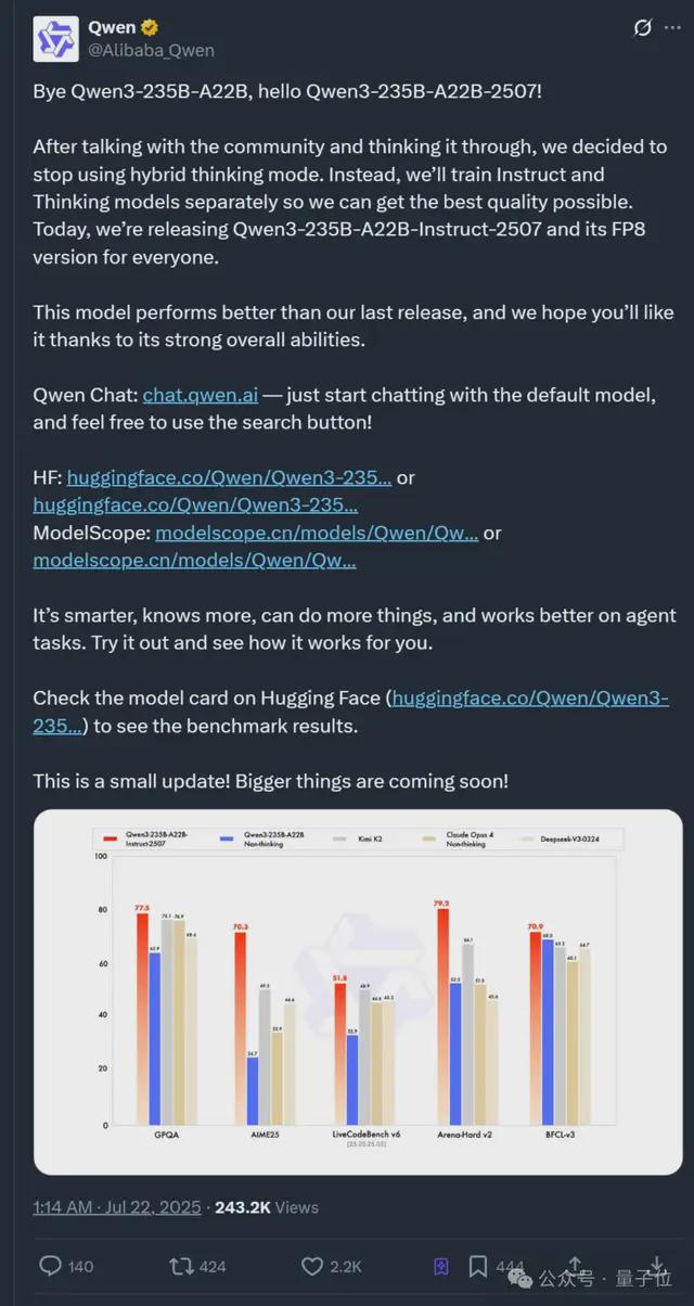 官方表示,他们停用了混合思维模式,改为分别训练Instruct和Thinking模型以提升质量,并正式发布性能更强的 Qwen3-235B-A22B-Instruct-2507及其FP8版本。