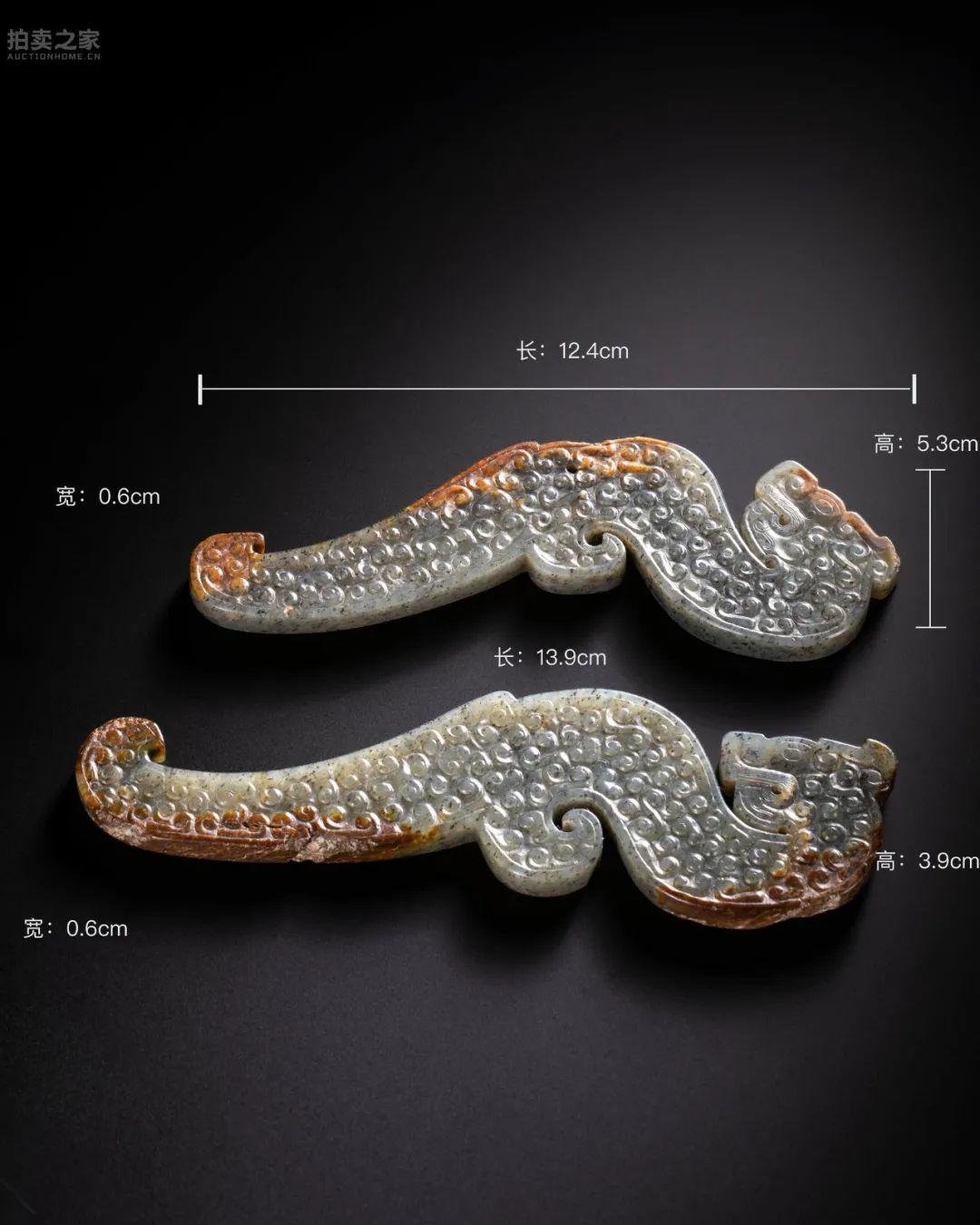 描述: 青灰色玉质,内部含有黑色芝麻点,局部因为白化而变黄,并有红褐色的受沁现象。此对玉龙的造形纹饰大体一致,龙首回顾上仰,弯颈,厚实的身躯弯拱,尾端上卷,龙身中间透穿一个系带孔,腹下出廓弯勾,或为一束鬣羽或为简化的足爪,既能充分运用拱身下方的玉料,也可以增加龙体形态的变化。玉龙口部以细扭丝纹为饰,下颚以阴刻的弧状线纹补白,其余龙身布满浮雕云纹和谷纹,是从浮雕虺龙纹解体演化而来的纹饰。