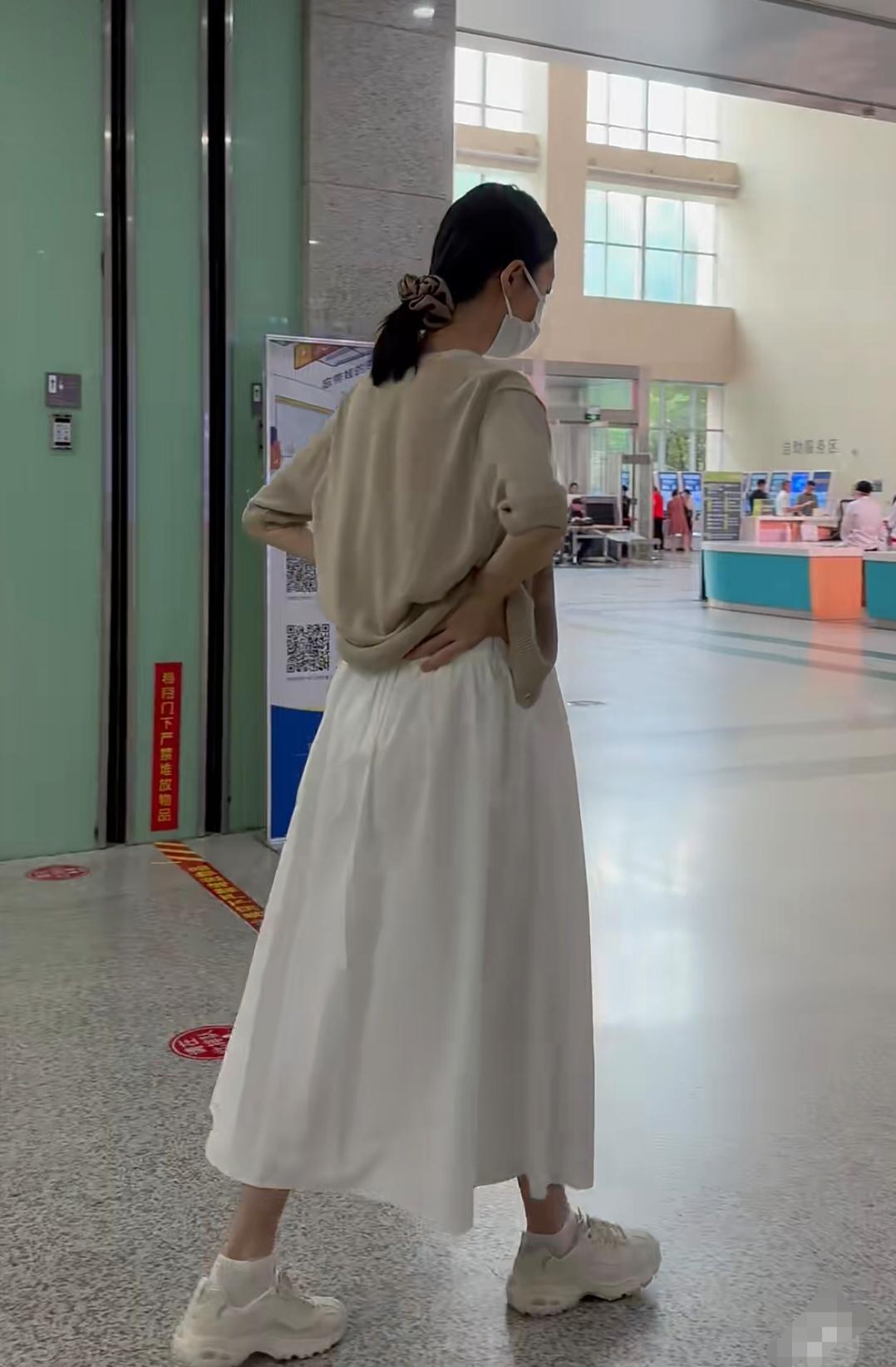 画面一转,陶珞依出现在医院里产检,只见她扎着低马尾,戴着口罩,身穿一条白色长裙,外搭针织外套,脚穿白色袜子和运动鞋,双手叉腰,正在缓慢地走着。