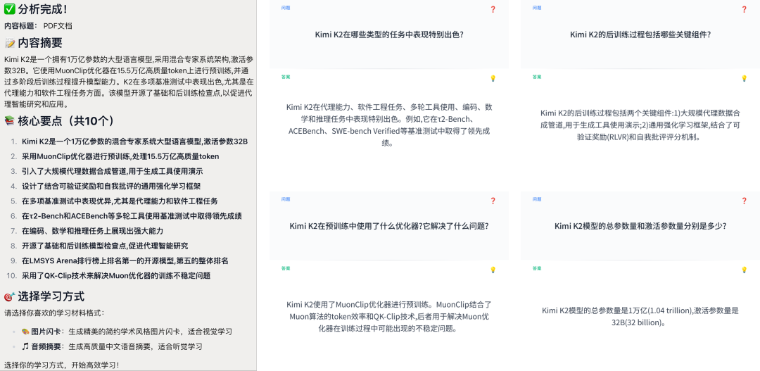 比如我这里拿个论文模型试一下,他会先生成对应的核心要点总结,然后你可以选择生成图片的闪卡或者解读播客。