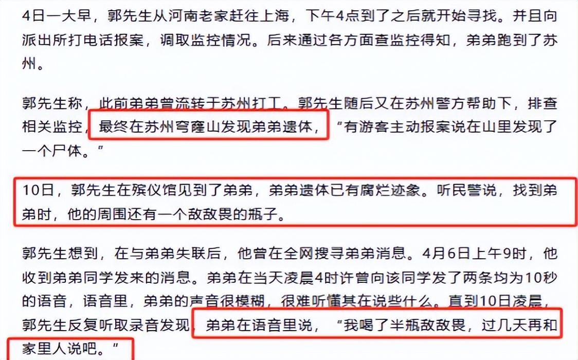 堂哥急疯了到处找,家里人连夜从老家赶到上海,报警、找人...整整找了6天!最后,坏消息从苏州传来:在一个偏僻的山上,找到了小郭已经开始烂了的尸体,旁边还有半瓶“敌敌畏”。他眼睛瞪得老大,死都没闭上!
