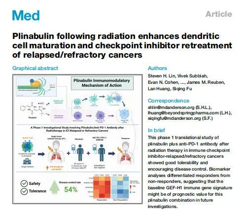 近日美国安德森癌症中心放射肿瘤学教授Stephen Lin团队在在Med杂志发表题为Plinabulin following radiation enhances dendritic cell maturation and checkpoint inhibitor retreatment of relapsed/refractory cancers研究文章。研究表明,普那布林(Plinabulin)联合放疗和免疫检查点抑制剂,在人体实验中,可促进树突状细胞(DC)成熟,并在多种癌症且先前免疫检查点抑制剂(ICI)治疗失败的患者中产生肿瘤疗效。该研究还发现了一种潜在生物标志物——基线GEF-H1免疫特征,有助于筛选患者并预测临床疗效。