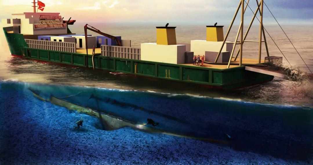 水下考古队员穿戴好个人潜水装备下潜到海底,通过抽泥抽沙管和水泡等专用工具,对海底沉船的特定位置进行水下发掘工作,对部分暴露出来的沉船残骸特征进行详细分析。