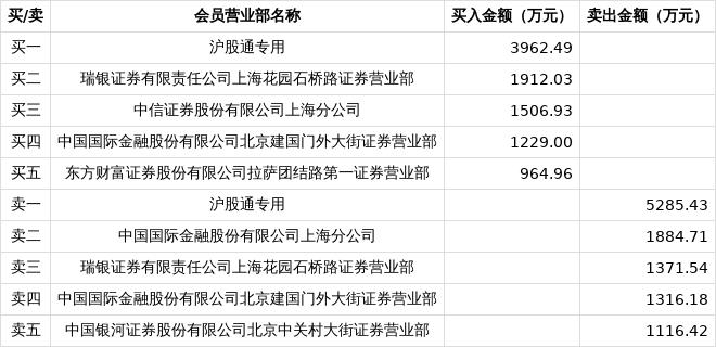 具体来看,今日上榜的营业部中,沪股通为第一大买入营业部及第一大卖出营业部,买入金额为3962.49万元,卖出金额为5285.43万元,合计净卖出1322.94万元。