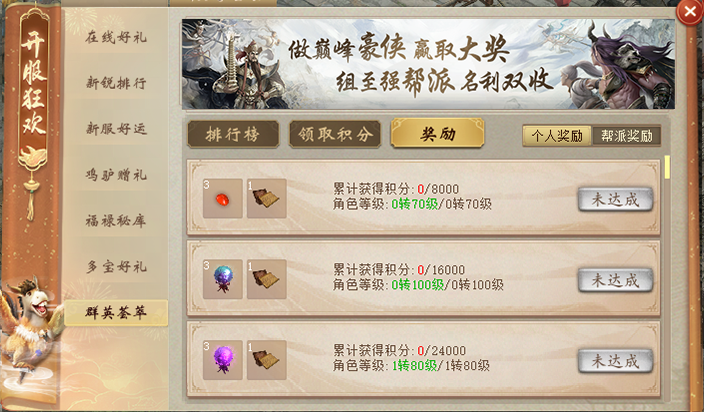 开服首月开启新服活动“群英荟萃”,少侠完成指定任务即可获得“个人积分”与“帮派积分”(“个人积分”与“帮派积分”同时获得且数额一致)。帮派中所有成员的“个人积分”与“帮派积分”的总和构成帮派评分,帮派评分排名还将决定首周帮派级别。