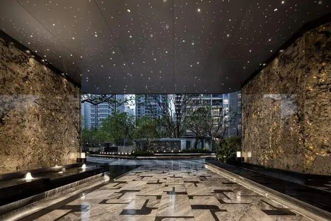 地上人行归家动线同样设计精巧。衔接主入口和社区空间的,是一条聚拢情绪的流光门廊。巴西透光雪山蓝奢石墙面,大西洋灰石材拼花地面,镶嵌上千颗灯珠的鎏金星空顶。穿过门廊,就是豁然开朗的“高山流水过庭”。长约67米,高约4米。浅色波浪灰石材为山,叠水为瀑,幻影蓝石材为湖。正中间是一棵冠幅超10m、树高约15m、重量达约20吨的全冠移植麻楝树。