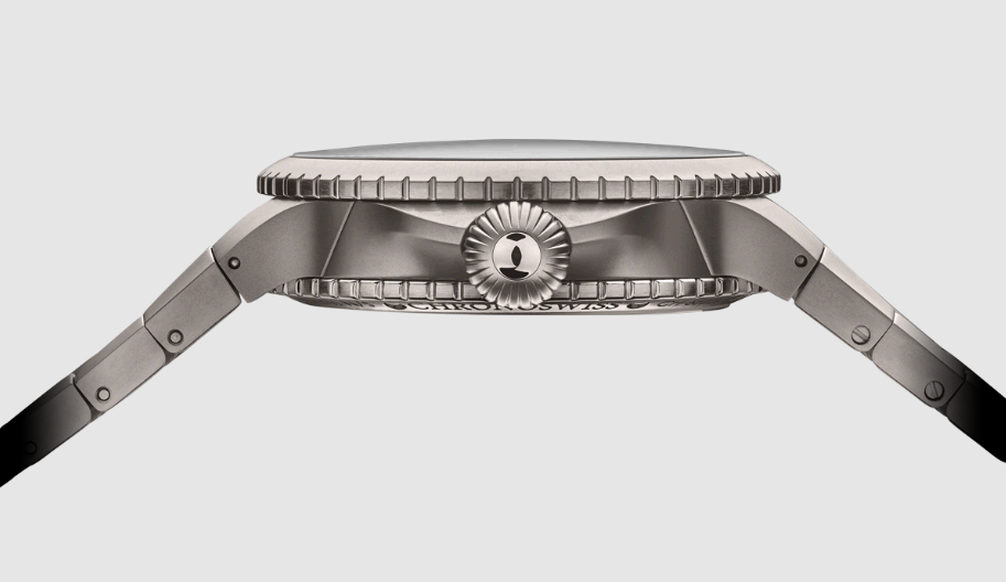 今年Chronoswiss发布了钛金属表壳,一体式表带的Pulse One Sand腕表。5级钛合金表壳直径41毫米,厚度12.75毫米,防水100米。腕表保留了Chronoswiss标志性设计,比如规范针的布局,飞行员风格的洋葱表冠;又兼具了当下流行的钛合金材质以及现代运动风格。