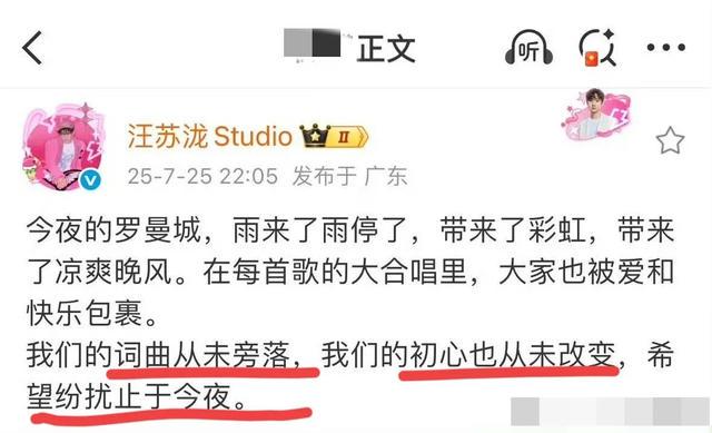 演唱会结束后,汪苏泷为了平息事件舆论,发了最后一条关于《年轮》原唱争议的图文。“词曲从未旁落,初心从未改变,望纷扰至于今夜”,显然是不希望张碧晨这边再发文扰乱视线。