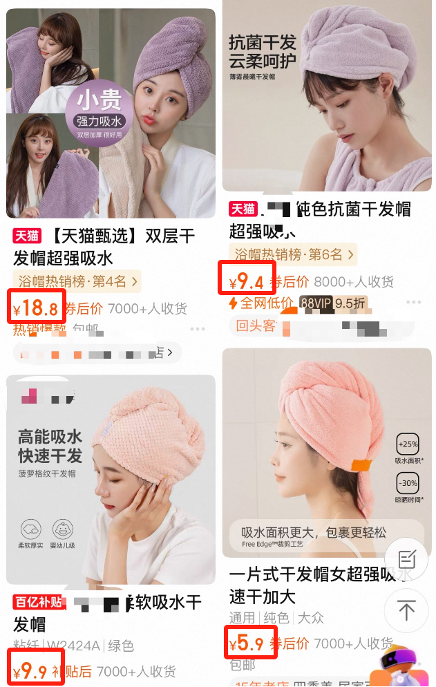现在网上有很多干发帽在售卖,价格也都参差不齐,几块到几十块都有。