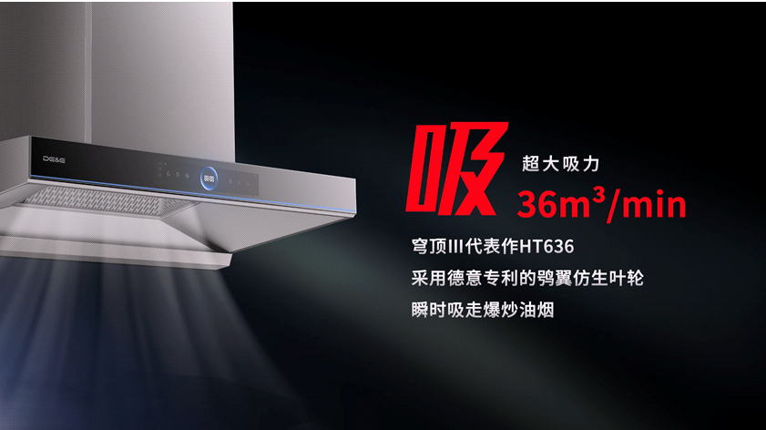 油烟被牢牢拢住之后,下一步就靠强劲吸力。穹顶III至尊版搭载鸮翼仿生叶轮配合高效变频电机高速旋转提供的源动力,形成高达36m³/min超大吸力,实现瞬时强吸、秒速净烟,烹饪过程告别烟熏火燎。值得一提的是,这一数值放眼整个厨电行业,也是遥遥领先,别无二家。凝聚了德意人对技术的极致追求。