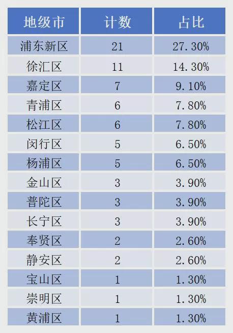 从地域分布看,根据地级市划分,浦东新区有21家,占比27.3%,优势显著;徐汇区有11家,占比14.3%;嘉定区有7家,占比9.1%,位居第三。