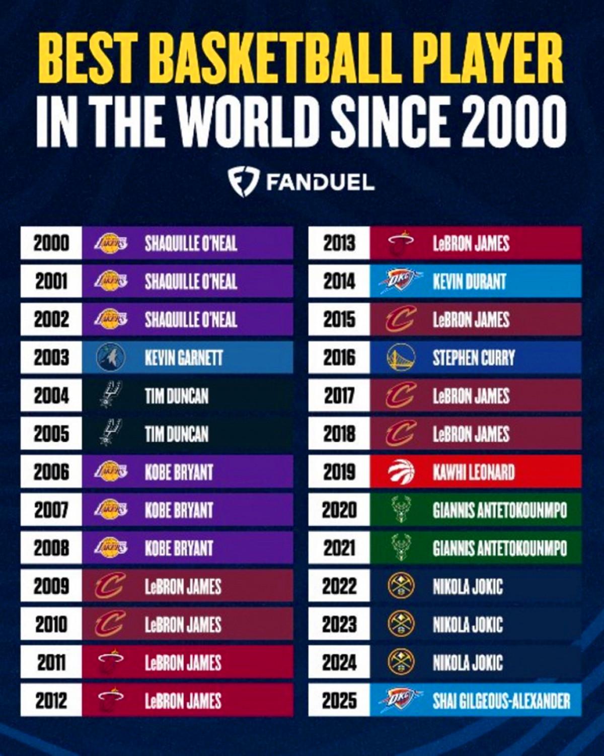 詹姆斯独占8年!在又一个赛季结束后,美媒也根据最新的表现评选出21世纪各年最强球星,其中一共11人入选,库里仅占一年。