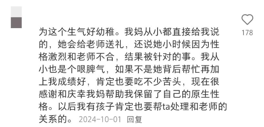 我妈小时候因为和老师不和被针对,我从小也是哏脾气,如果不是她背后帮忙再加上成绩好,肯定也要吃不少苦头。以后我有孩子肯定也要帮忙处理和老师的关系。