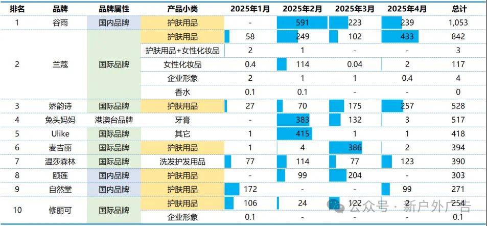 其中,国内品牌护肤品“谷雨”以大手笔投放位居首位。从月度投放趋势看,头部品牌倾向于2月、3月、4月进行营销推广,这是由于“节庆消费余温 + 气候护肤需求痛点 + 渠道促销节点”三重叠加效应。