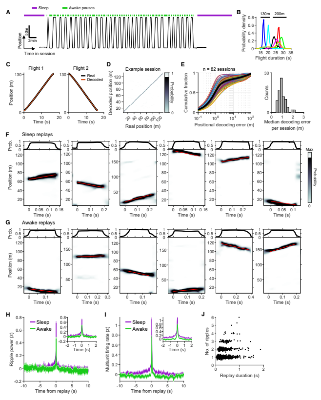 研究首先确立了核心实验平台:在一条长达200米(或130米)的隧道中,蝙蝠自由往返飞行,海马CA1区的神经群体活动被高精度无线记录。研究者利用无聚类的贝叶斯状态空间解码器,对飞行期间神经活动进行位置解码,解码精度极高。随后,作者将同样的解码器应用于睡眠和清醒静息期间的神经放电,以寻找 replay 事件。他们发现,无论在睡眠还是觉醒静息状态,蝙蝠海马中都存在大量 replay 序列。这些 replay 通常出现在 sharp-wave ripple(SWR)事件期间,并伴随全体神经元放电率的升高,符合以往关于 replay 的经典定义。然而,与小环境中 replay 通常覆盖完整路径不同,蝙蝠的 replay 序列仅覆盖路径中的一小段——约6%的隧道长度,从而引出了本研究最核心的现象:在大尺度空间中,replay 呈现出强烈的“碎片化”特征。