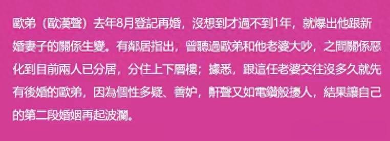 据台媒7月29日爆料,46岁的欧弟与第二任妻子结婚不到一年,婚姻已亮起红灯。两人目前处于分居状态。此消息一出引发了网友们的热议!